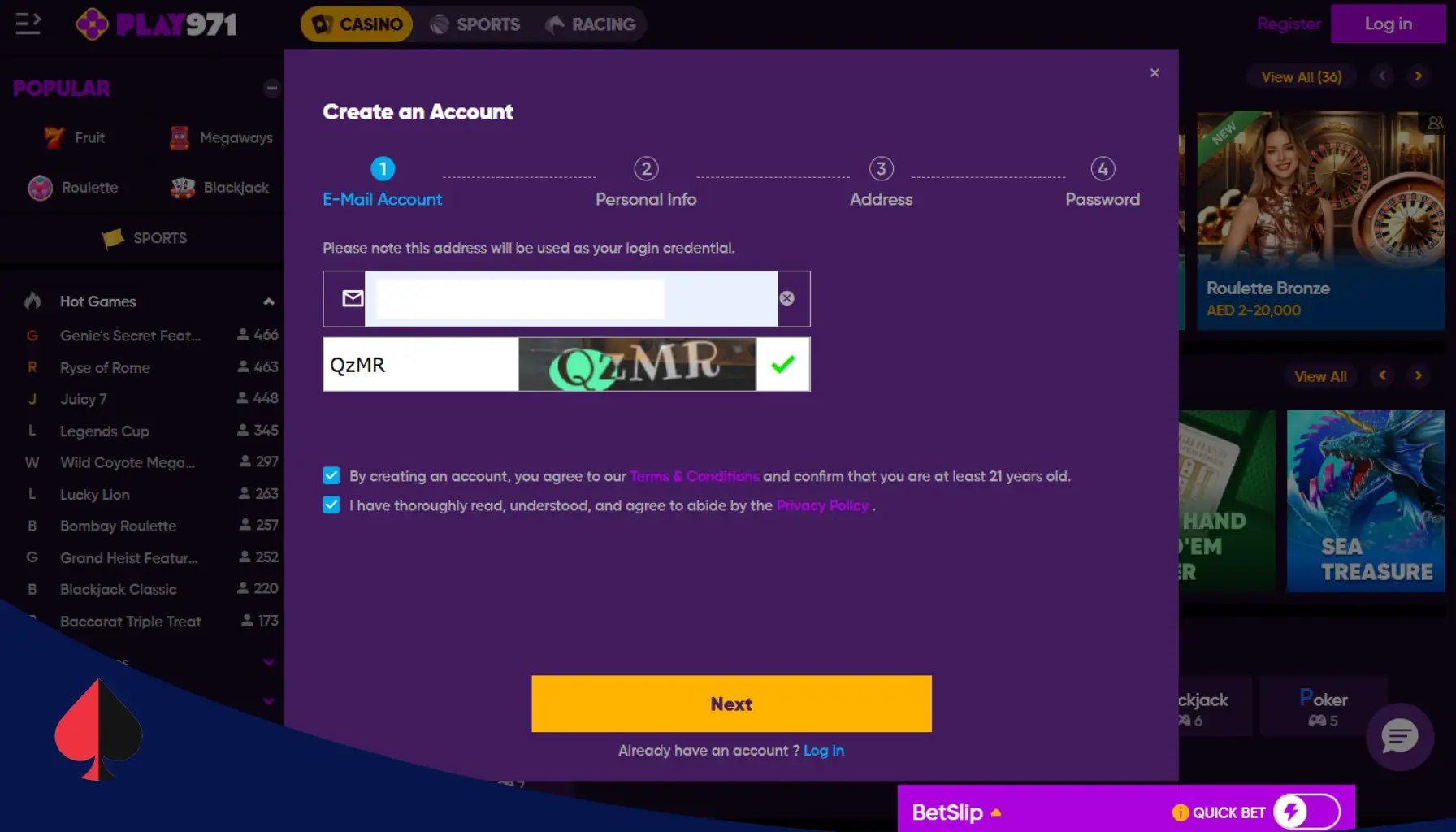 2. إنشاء الحساب: عن طريق النقر على زر “التسجيل”، تكون قد بدأت أولى خطوات التسجيل لدى بلاي 971، حيث ستتم إعادة توجيهك لنموذج التسجيل.